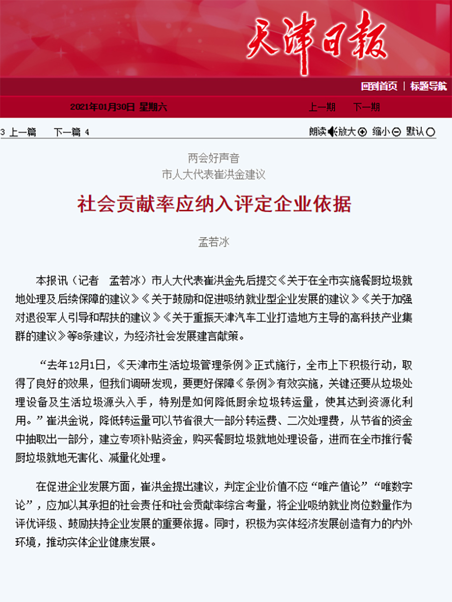 两会好声音 市人大代表崔洪金建议---社会贡献率应纳入评定企业依据